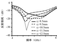 作为最主要的辐射结构,金属圆盘的尺寸在很大程度上决定了天线的谐振频率,图3是针对不同的金属圆盘半径r1反射损耗随频率的变化曲线。随着半径的增大,天线的谐振频率逐渐向低频端偏移,与一般的单偶极子天线类似,辐射体尺寸与天线频率呈现出相反的变化规律。