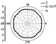 对于全向天线,增益特性是衡量其性能好坏的重要指标,图8是该天线的增益随频率的变化关系(fL ~ fH)。频率在fL ~ fH范围内,增益变化范围是3.5~6dB,变化幅度小于2.5dB,增益在频带内较为稳定;天线的方向图是表征天线辐射特性与空间角度关系的图形,图9表示该天线在频率分别为fL、(fL+fH)/2、fH时水平面方向图的结果。在各个频率上,该天线水平面近似全向辐射,不圆度小于2dB,方向图稳定性较好。